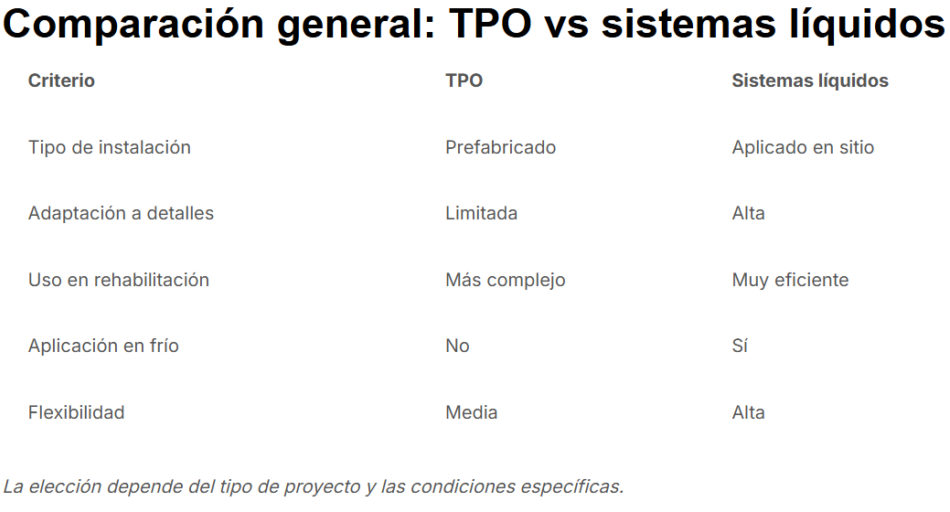 En estos casos, los sistemas líquidos suelen ofrecer mayor versatilidad y facilidad de aplicación, sin necesidad de desmontar cubiertas existentes.